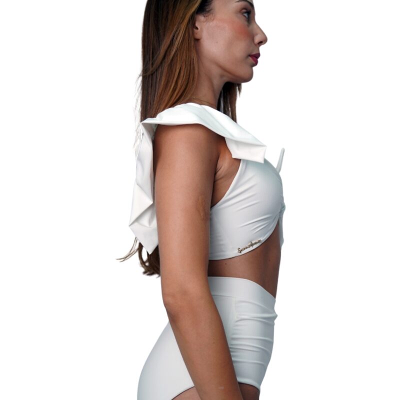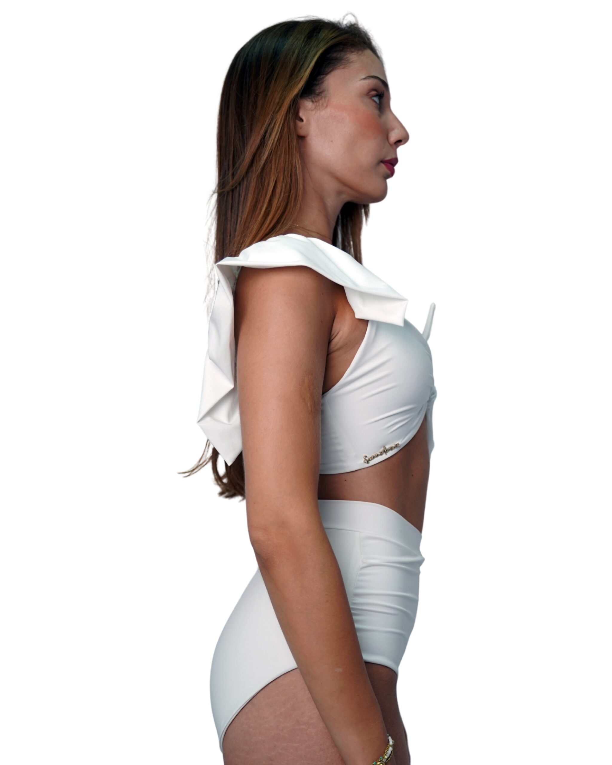 Ultra feminine bikini made with ruffle sleeves and a front bow tie knot